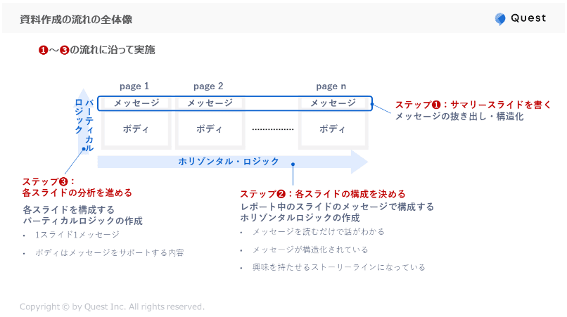 ステップ1のサマリースライド作成が完了した後は各スライドの構成を考えます。このプロセスでは、全体構成の内容をスライド上で適切に表現することを目的としています。詳細の記事ではスライドにおいて必ず記載されていなければならない要素や、適切なレイアウトとはどのようなものかについて触れていきます。