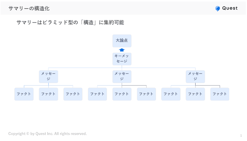 ※構造化された文章は、次のように、ピラミッド型フォーマットでビジュアライズすることが可能です。ここでは、ポイントを説明するうえで、便宜上、ピラミッド型に直しています。